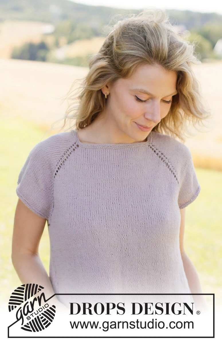 Knitted top in DROPS Safran. The piece is worked top down in stockinette stitch with raglan, short sleeves and ridges. Sizes XS - XXXL.