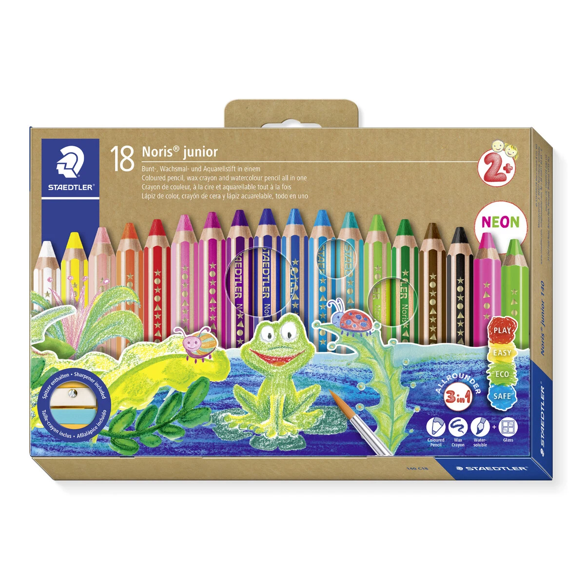 Noris Junior is a great choice when you want to give children a versatile, robust and easy-to-use colouring tool. You get 18 assorted colours and a handy sharpener in one box, so you can get started straight away. The pencils are made from wood from certified, sustainably managed forests.
