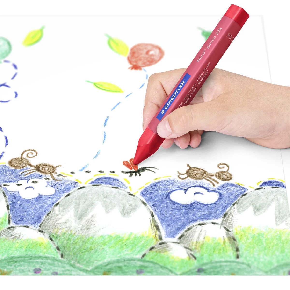 STAEDTLER® Noris Jumbo wax crayons are made for those first creative moments, where little hands need a secure grip and great results straight away. The round jumbo crayons sit steadily in the hand and create a smooth, colourful line, making it easy to fill larger areas. With brilliant colours, they are ideal for everything from free imaginative play to more guided drawing tasks. The paper sleeve also helps keep fingers clean and makes the crayons more hygienic to share.