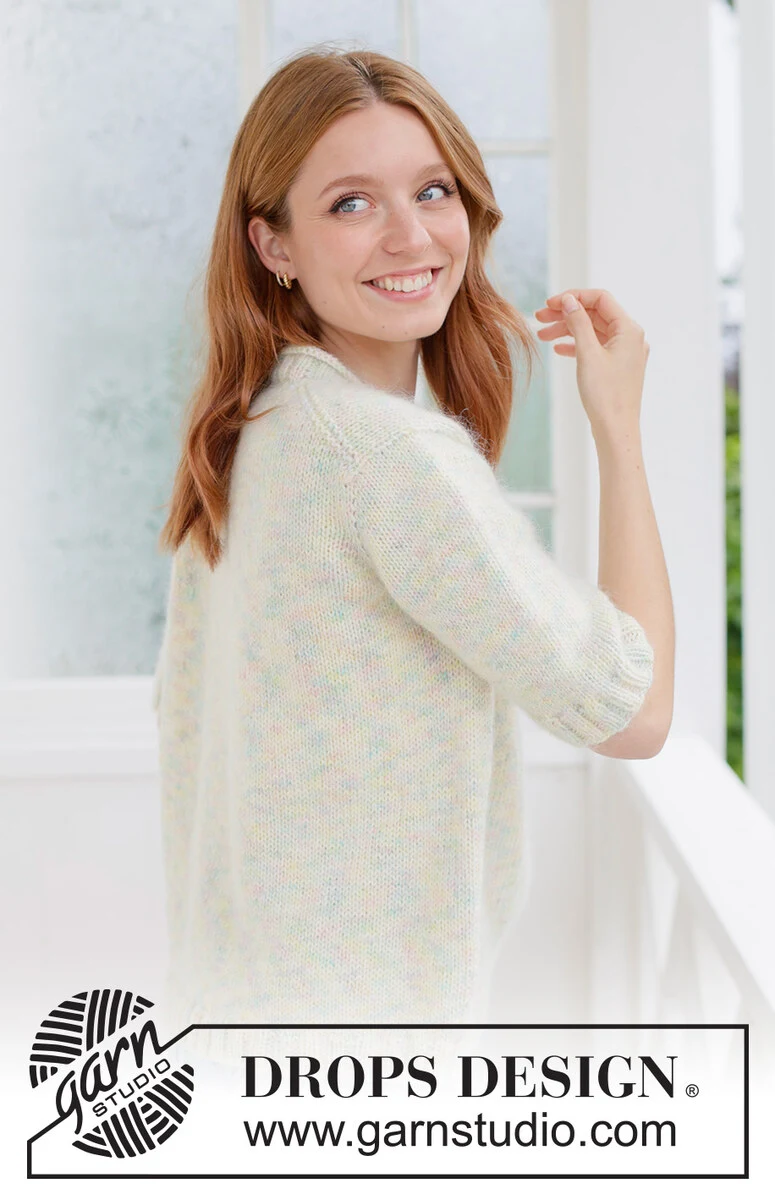 Knitted sweater in DROPS Fiesta and DROPS Kid-Silk. The piece is worked top down in stockinette stitch with European yoke, short sleeves and rolled neck-edge. Sizes XS - XXXL.