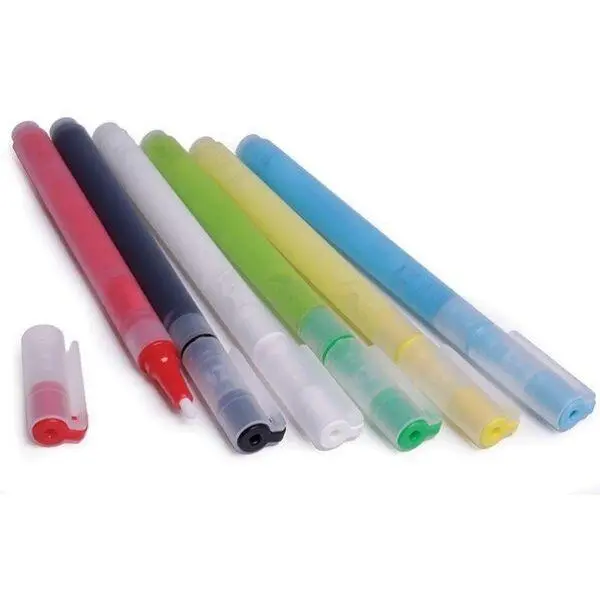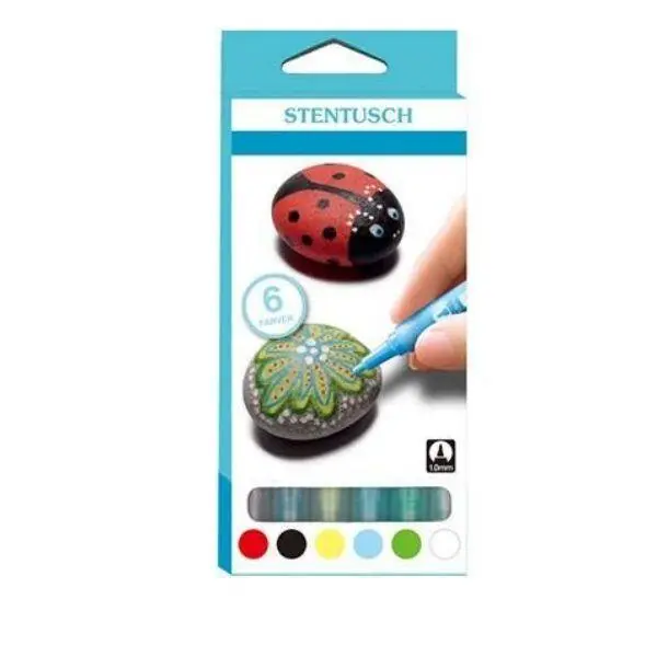 The package contains 6 markers in the colors: Yellow, green, blue, red, black and white.