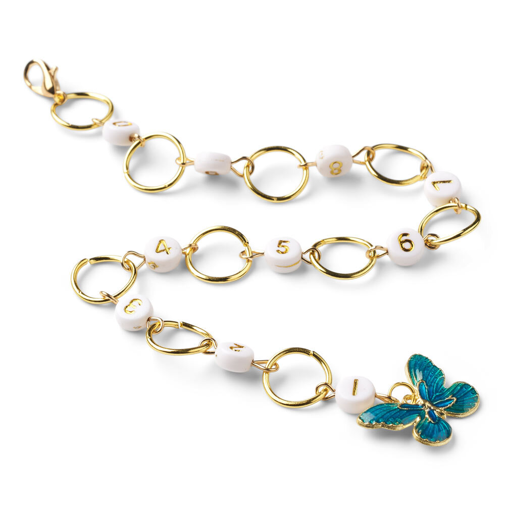 The row counter chain from LindeHobby is a clever and stylish tool that helps you keep track of rows and stitches while knitting or crocheting. It consists of a chain with white beads numbered 0 to 9, each connected by gold-colored metal rings. The chain ends with a decorative turquoise butterfly and fits needles and hooks up to US 13 (9.00 mm).
