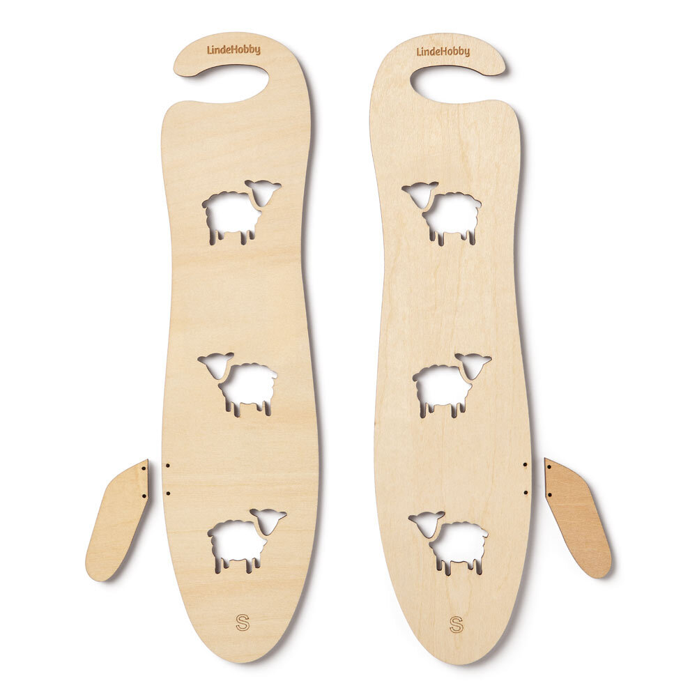 Practical mitten blockers made of plywood, ideal for shaping and drying hand-knitted mittens. The product comes as a set in Small, Medium and Large sizes.