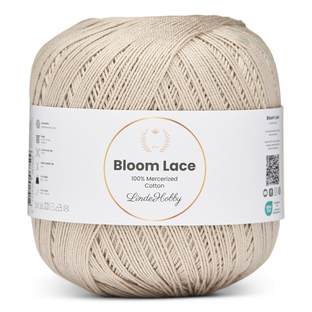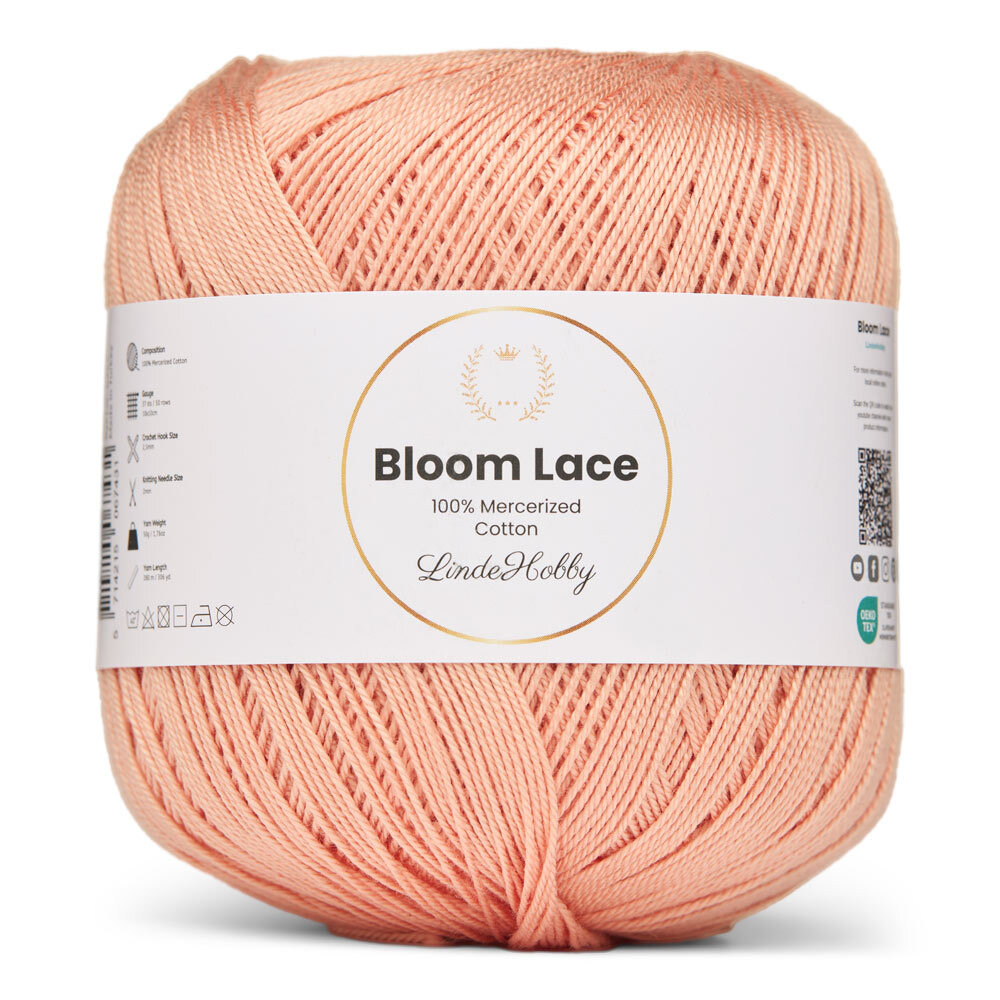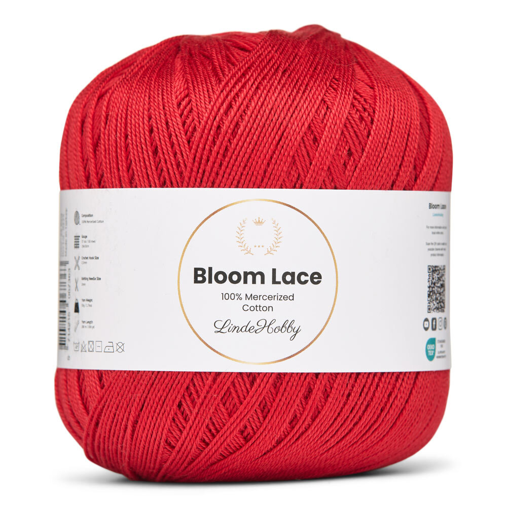 LindeHobby Bloom Lace is a luxurious lace yarn made from 100% mercerized cotton. It features a beautiful, glossy surface and a dense, smooth texture that gives your finished projects a refined and exclusive look. This fine and delicate yarn is perfect for creations that require precision and an elegant finish.