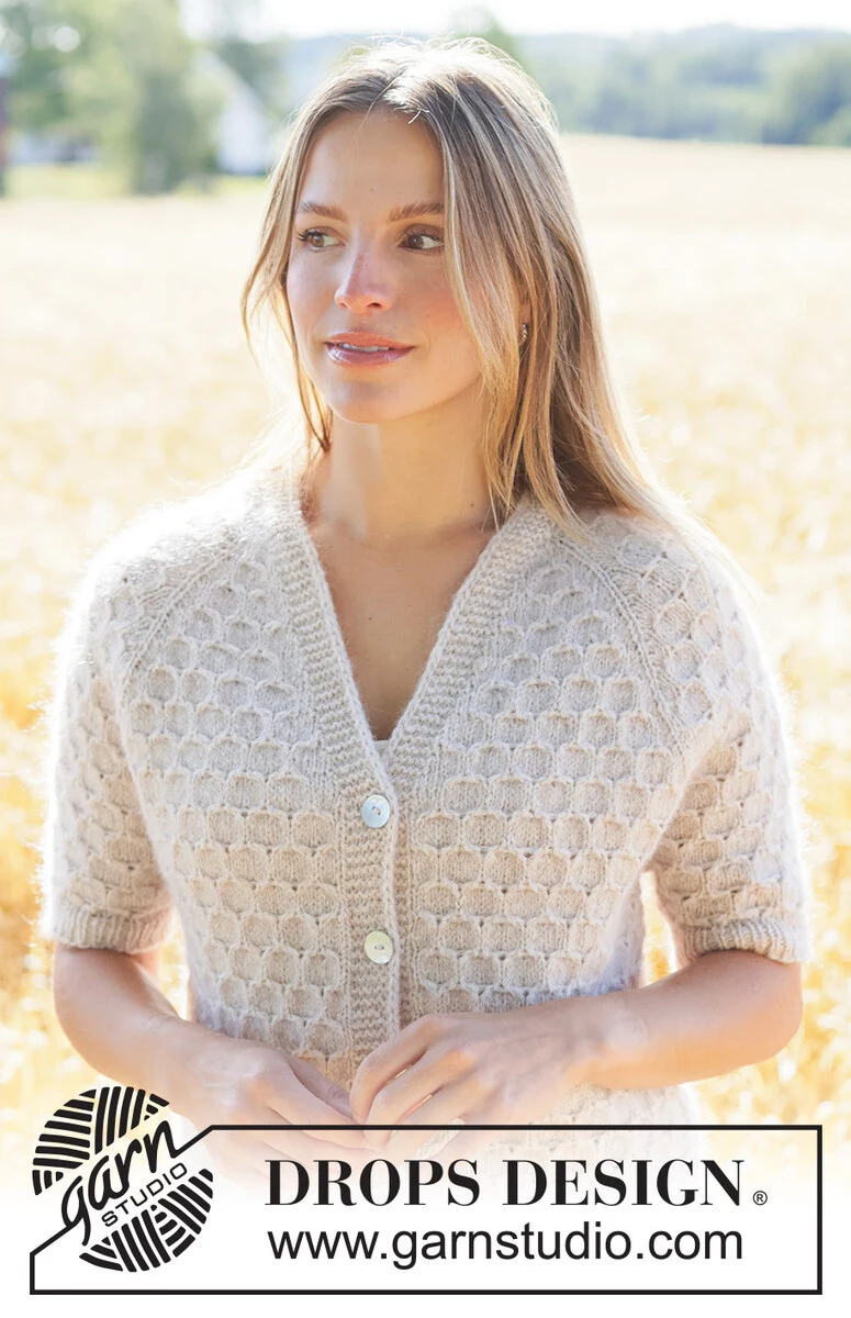 Knitted jacket with short sleeves in DROPS Sky and DROPS Kid-Silk. Piece is knitted top down with raglan, V-neck, I-cord and honeycomb pattern. Size XS – XXXL.