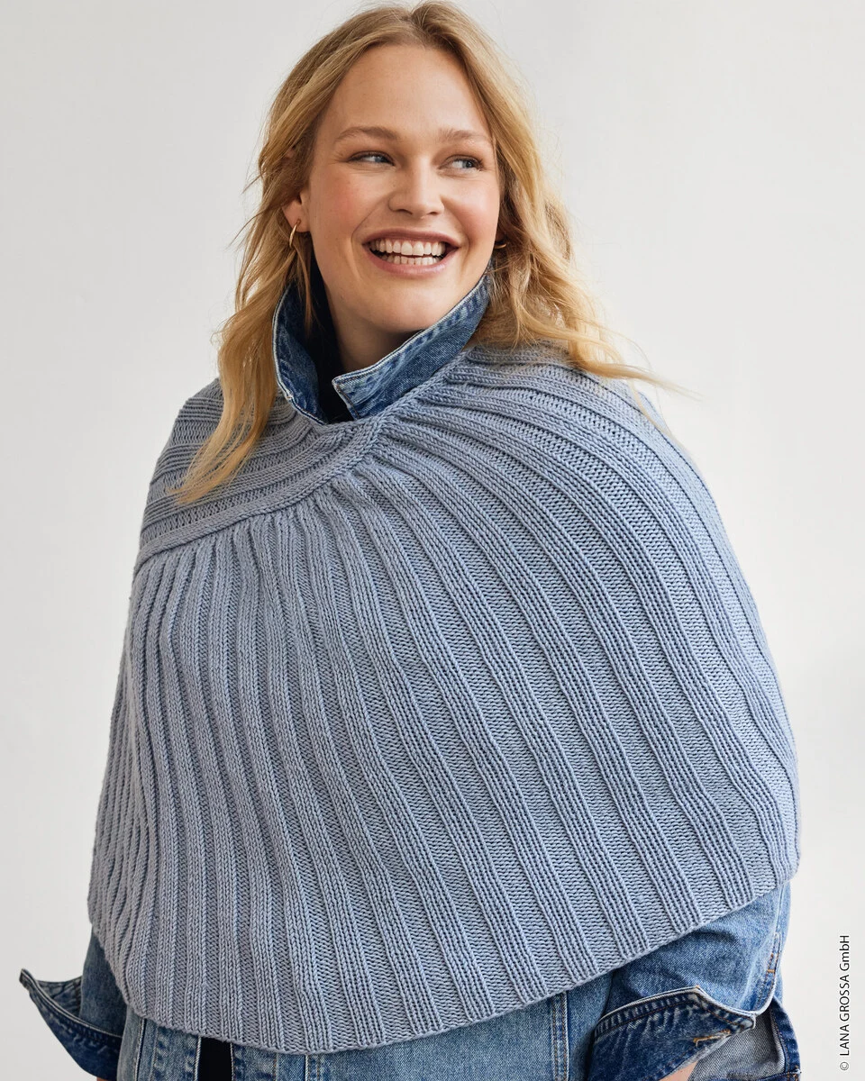Knitted poncho in Lana Grossa Cool Wool Big. The poncho is worked in rib with a slanted shape and finished with a neat I-cord edging. Size approx. 102 (112) cm in circumference and 50 (58) cm in length.